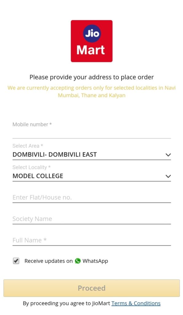 Now, Clicking on the link leads you to a page where you have to feed your Mobile Number, Area, Locality, House Number, Society Name, Full Name and then you have to check on the option to receive updates on WhatsApp and then click on the Proceed button like as I show you the screenshots below.