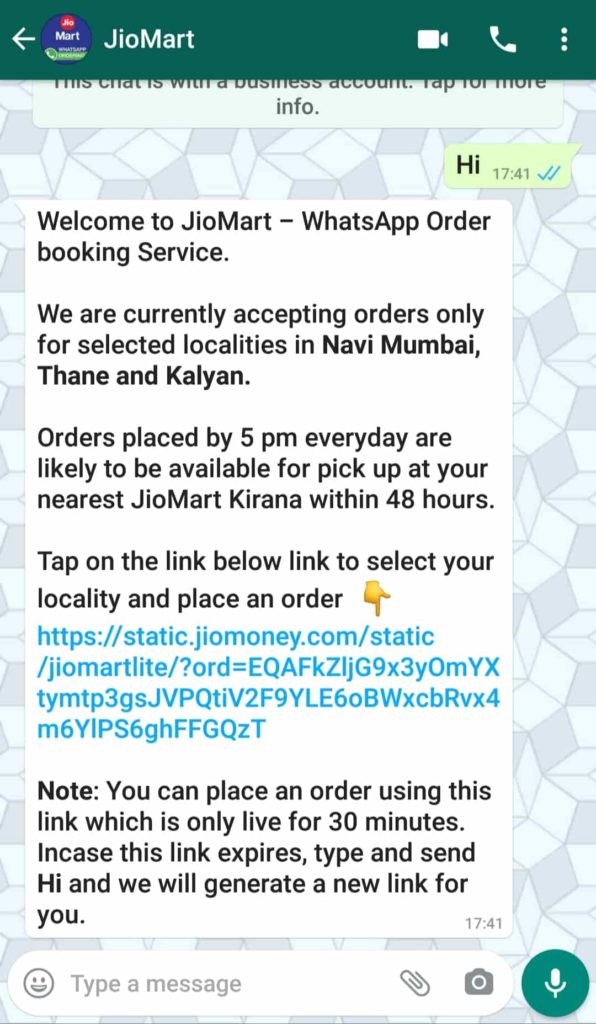 To order grocery items via JioMart, Users residing at above places just have to save a number i.e. 8850008000 on WhatsApp and ping them anything, just like say Hi and the JioMart WhatsApp account send you a link. Do note that the link goes live only for 30 minutes, however, to generate a new link you can again ping them Hi and they will send you a new link.